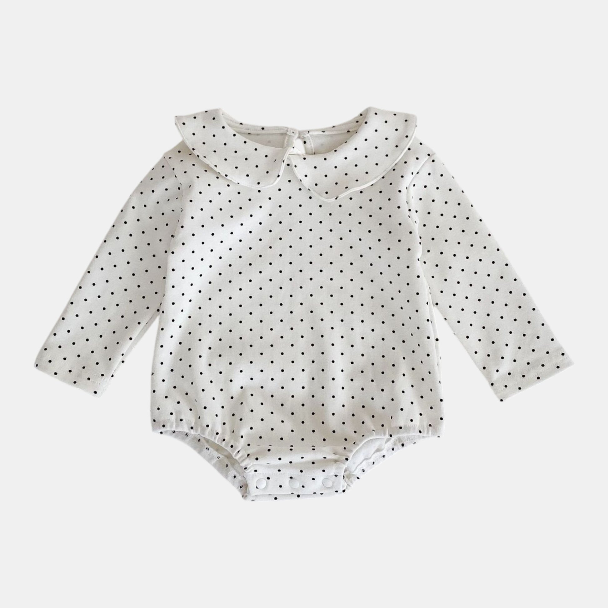 Tiny black polka dots add playful charm to this soft cotton bodysuit, while the classic Peter Pan collar keeps it sweetly timeless. Designed for easy dressing with snap-fastening closures, it layers beautifully under pinafores or pairs simply with linen shorts. A lovely everyday piece that always looks put together.