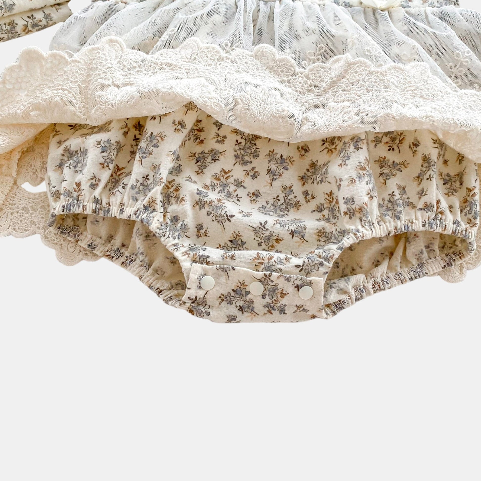 This sweet floral romper dress and bonnet set features a delicate lace overlay skirt and buttoned crotch for convenience. Soft cotton keeps little ones cosy, making it perfect for dressing up, portrait sessions, or special family occasions.