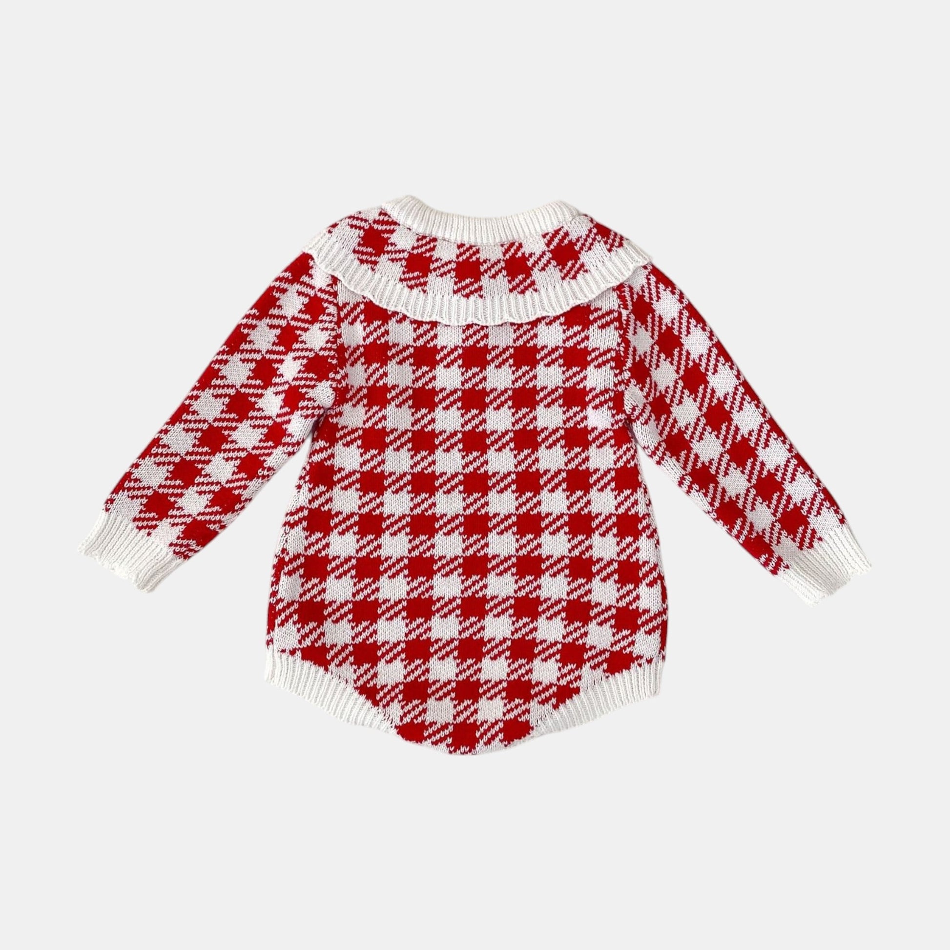 A houndstooth romper in ruby red and white cotton, trimmed with contrast edging and a statement collar. Snap cuffs and crotch fastenings for practicality, long sleeves for crisp-day adventures. Pair with ribbed tights or let bare knees roam free—timeless from first steps to birthday tea.
