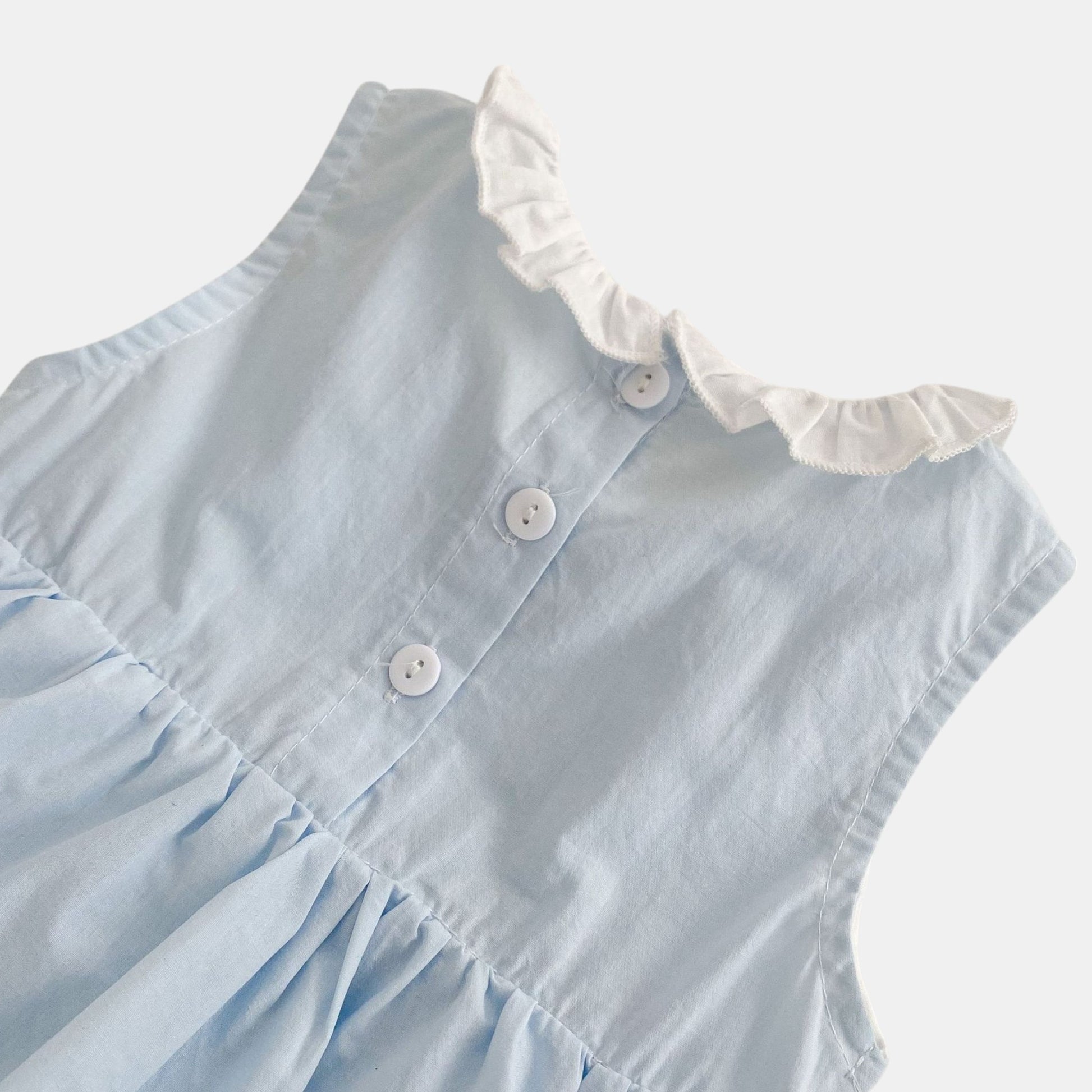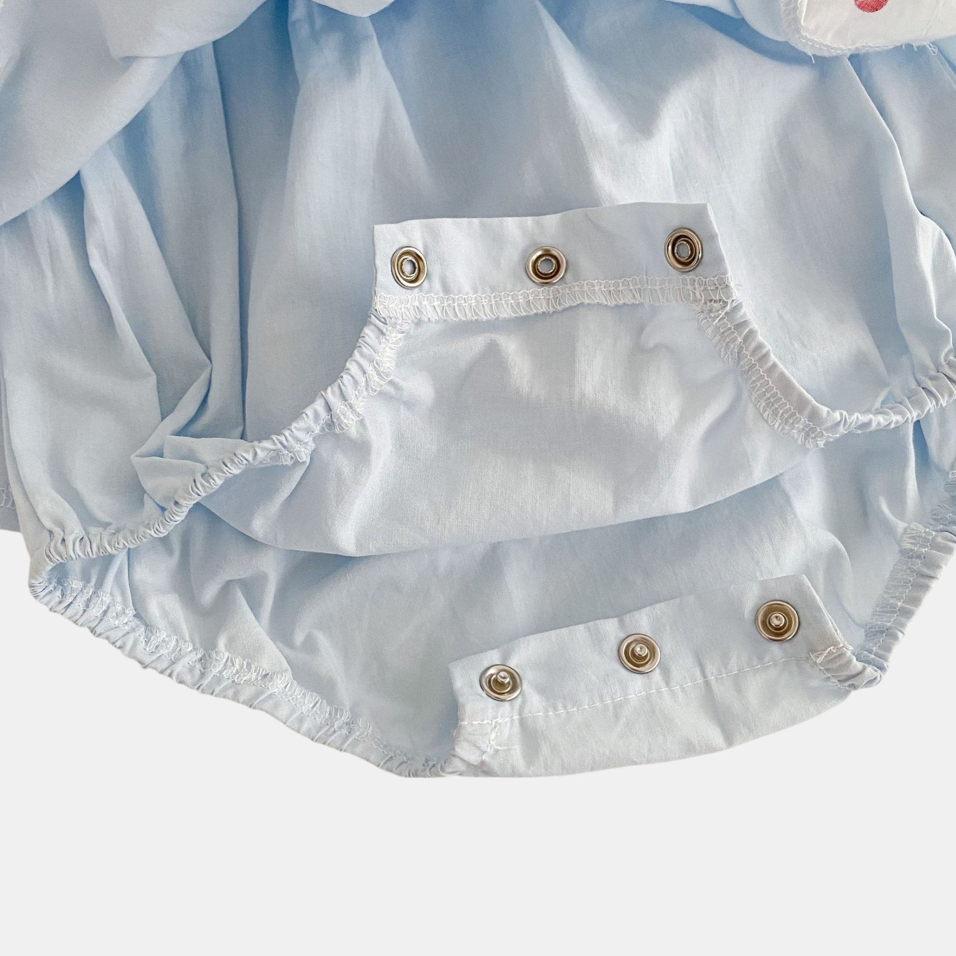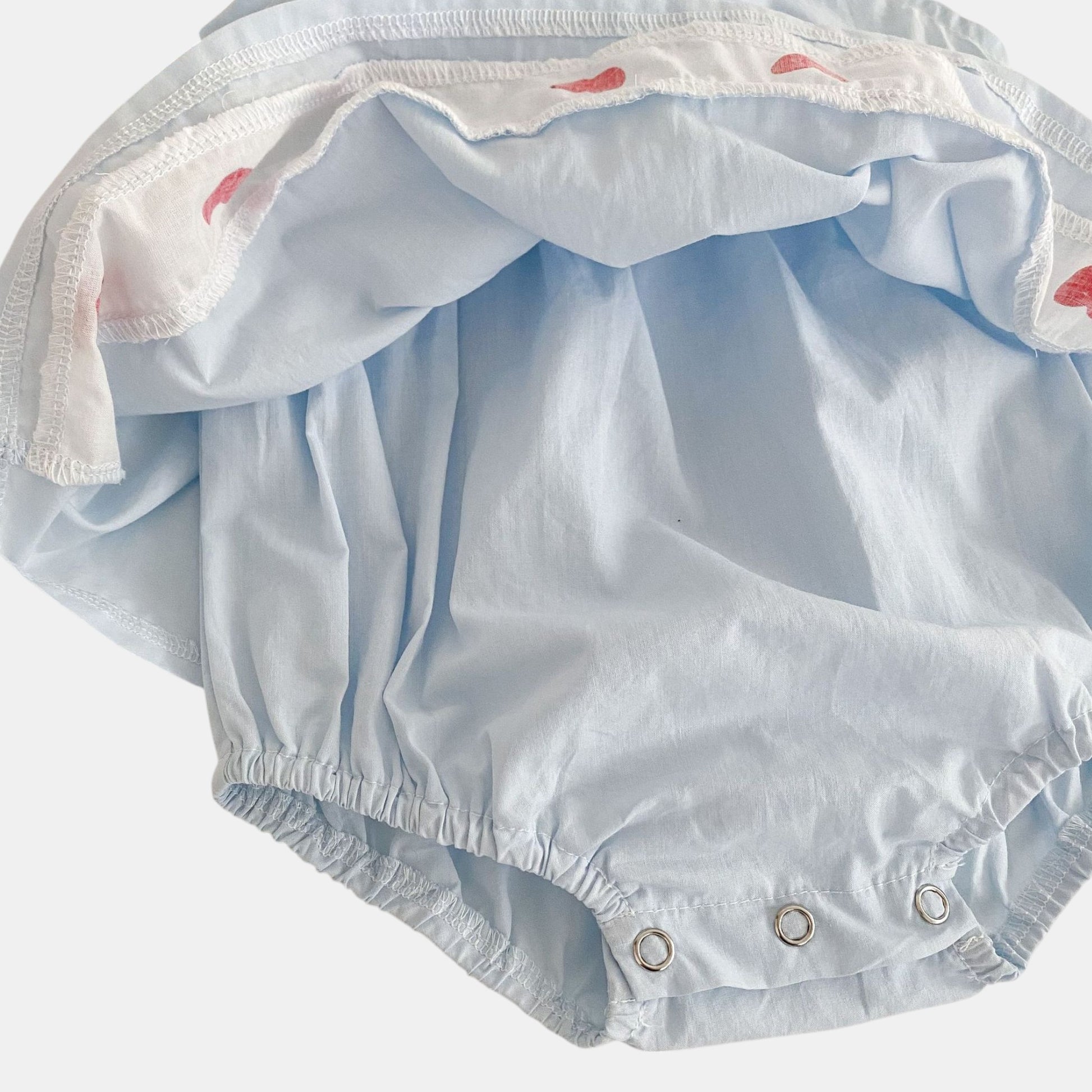 Light and airy, this blue cotton romper dress features a dainty ruffle collar and little red heart accents, with snap buttons at the crotch for convenience. Pair with simple sandals for casual days or a lightweight cardigan for a more dressed-up look. Ideal for tiny adventures in the park or quiet afternoons filled with giggles.