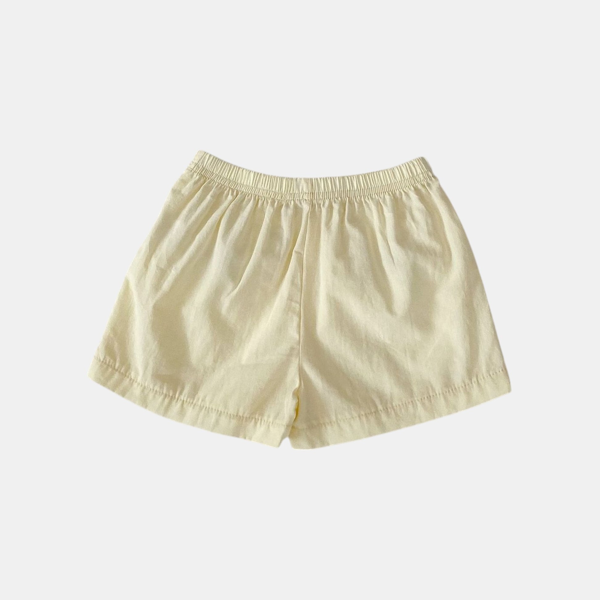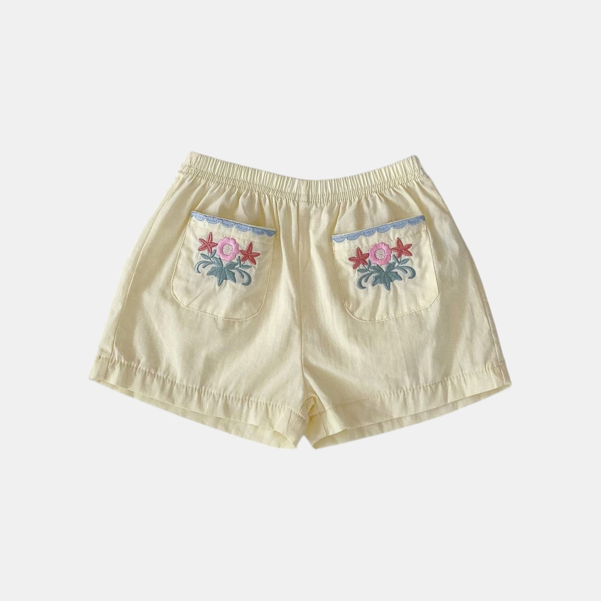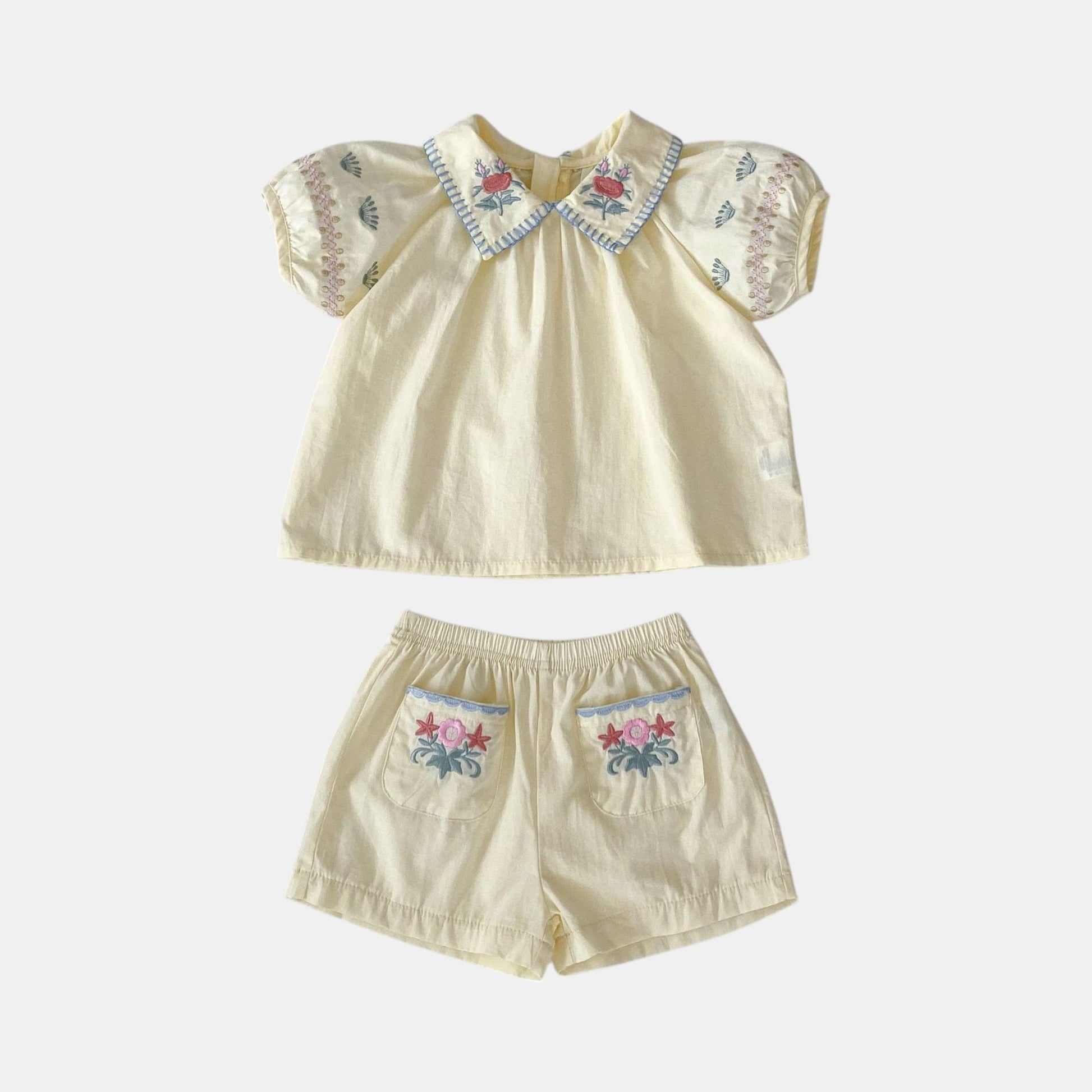 This sweet two-piece set in a soft yellow cream shade features a puff-sleeve top adorned with delicate floral embroidery at the collar and sleeves. The matching elasticated shorts offer comfort and practicality with their two front pockets. Perfect for sunny adventures, from garden playdates to family outings.