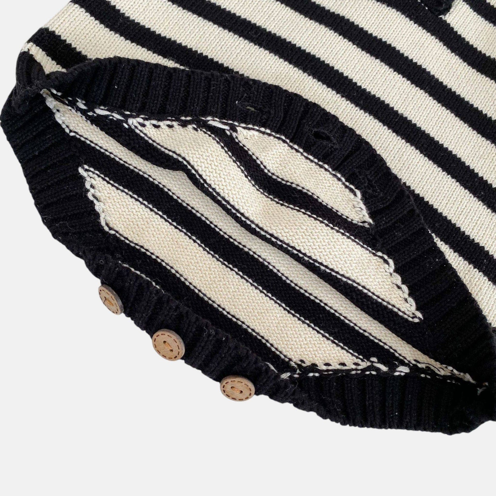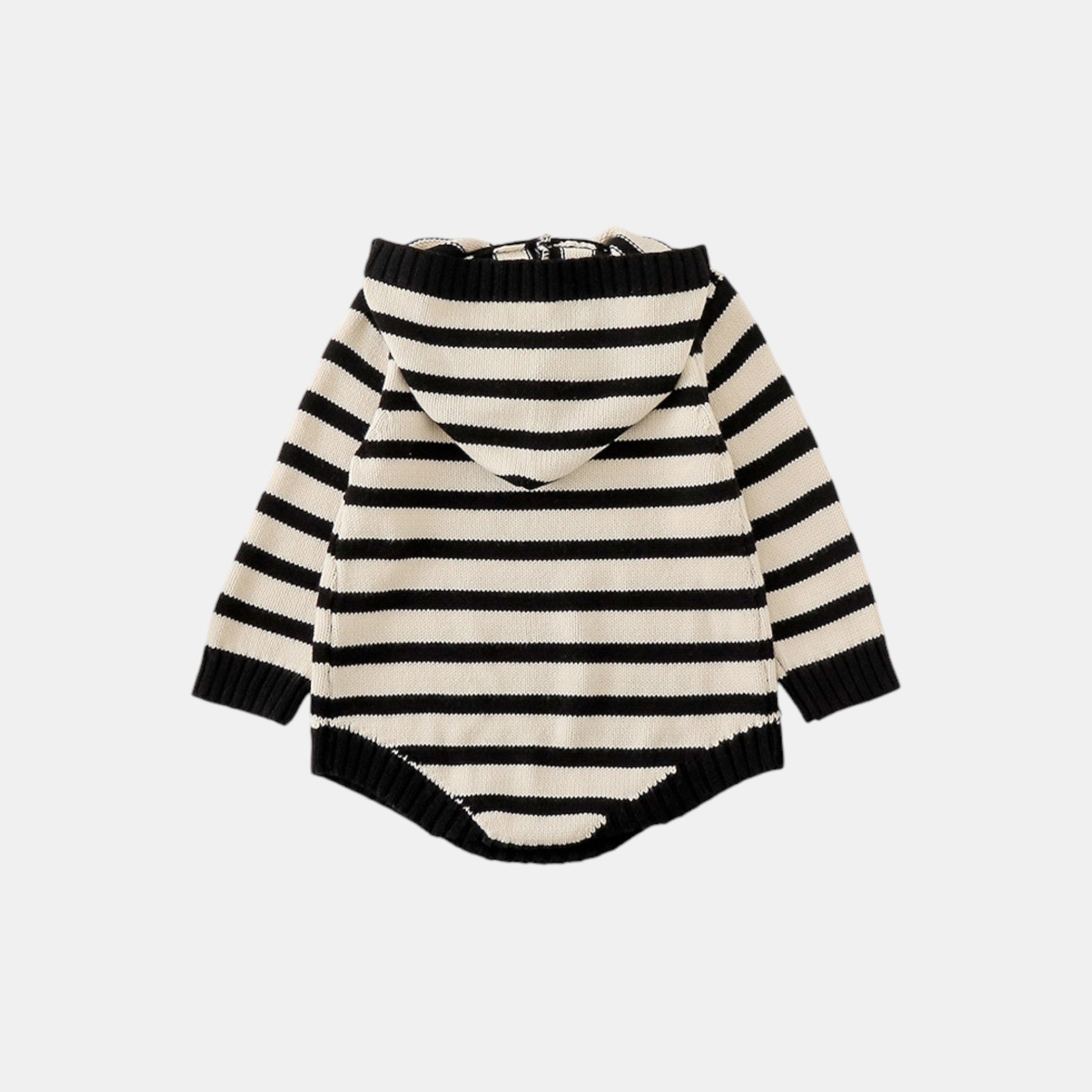 A cream cotton romper with the easy appeal of charcoal stripes, its hooded silhouette and button-fastened placket designed for real little lives. The long sleeves cocoon without constricting, while the crotch fastenings make changes as simple as sunshine. Wear it for park adventures, nursery mornings, or those golden-hour cuddles when the day winds down – a piece that understands childhood should always feel this soft.