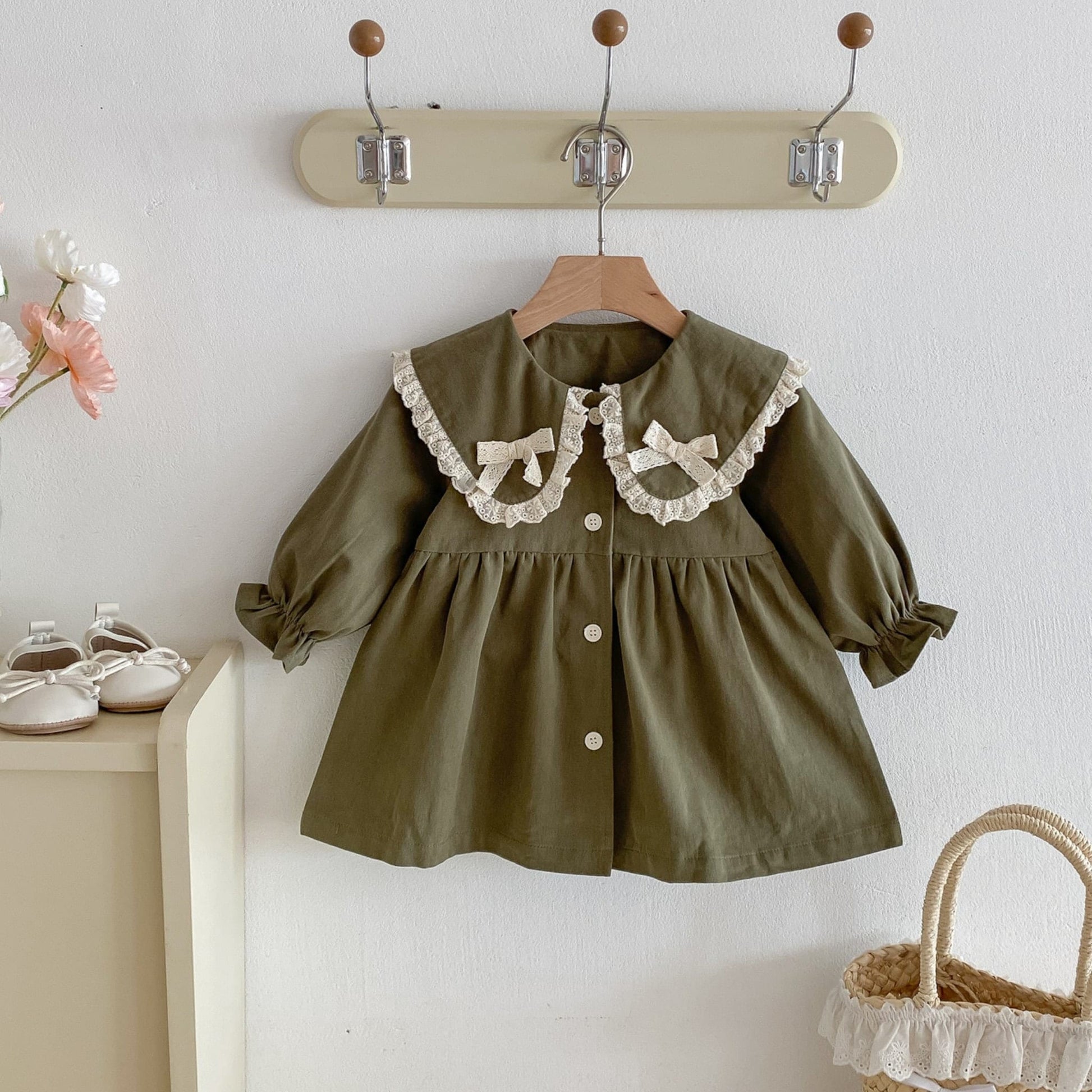 This olive green cotton dress is perfect for autumn, featuring a large statement collar with lace trim and delicate bows. Button-front details and long sleeves make dressing easy, while soft cotton keeps little ones comfortable for playtime, storytime, or layering with tights for cooler days.