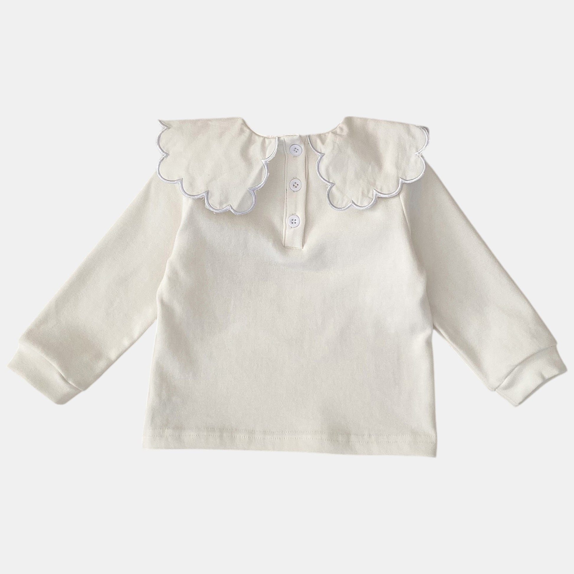 An ivory cotton top with a square scalloped collar and delicate floral embroidery. Wear it with linen bloomers for special occasions, or soft leggings for everyday ease. For polished moments and playground adventures alike.