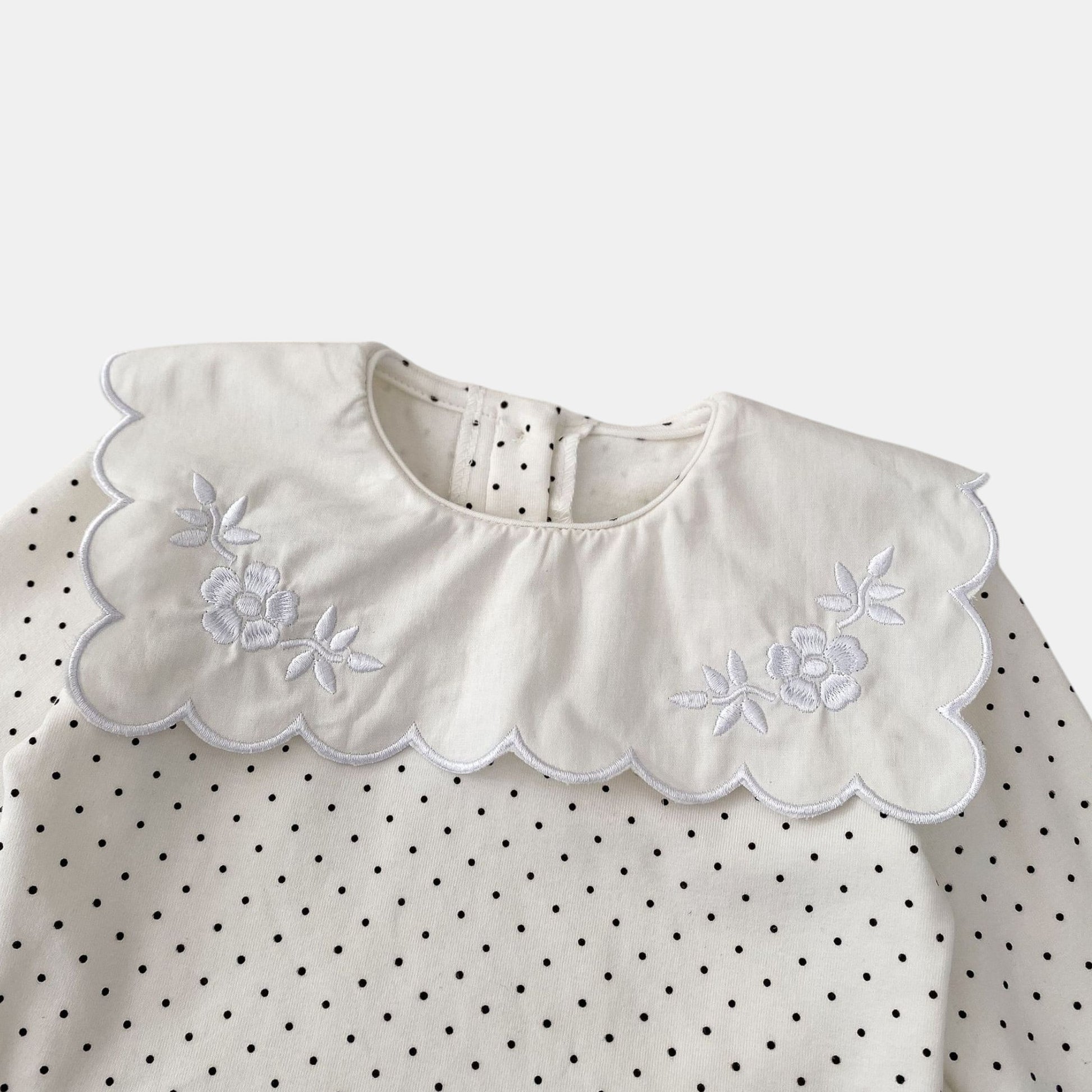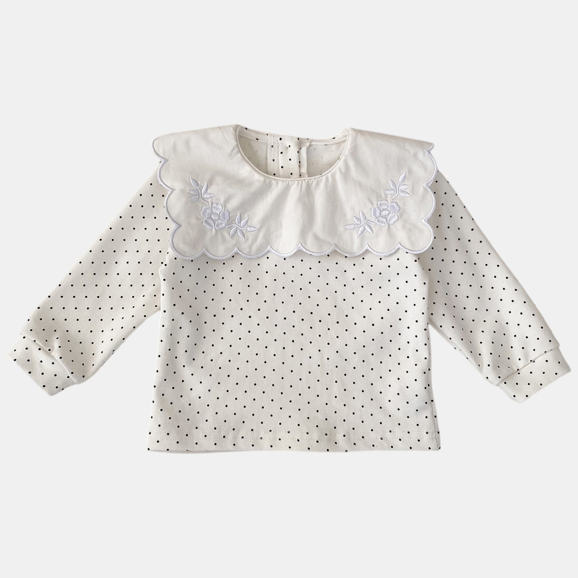 An ivory cotton top with a statement square scalloped collar and playful polka dots. Wear it with smocked dungarees for special days, or soft leggings for everyday adventures. As sweet with birthday cake as it is with biscuit crumbs.