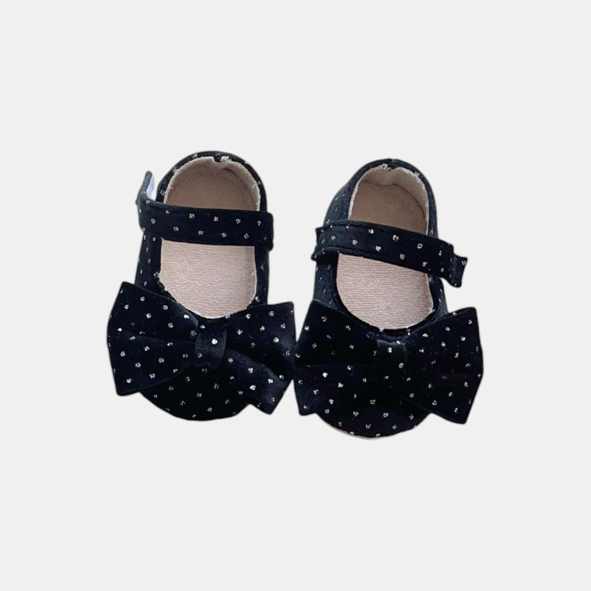 Black velvet, a tiny bow, and twinkling silver dots—these little shoes feel just right for Christmas mornings, cosy family gatherings, or quiet afternoons at home. The round toes and soft rubber soles let little feet move comfortably, and the velcro straps make slipping them on completely fuss-free. They’re easy to wear, just as charming as they look, and perfect for little steps that sparkle with every turn.