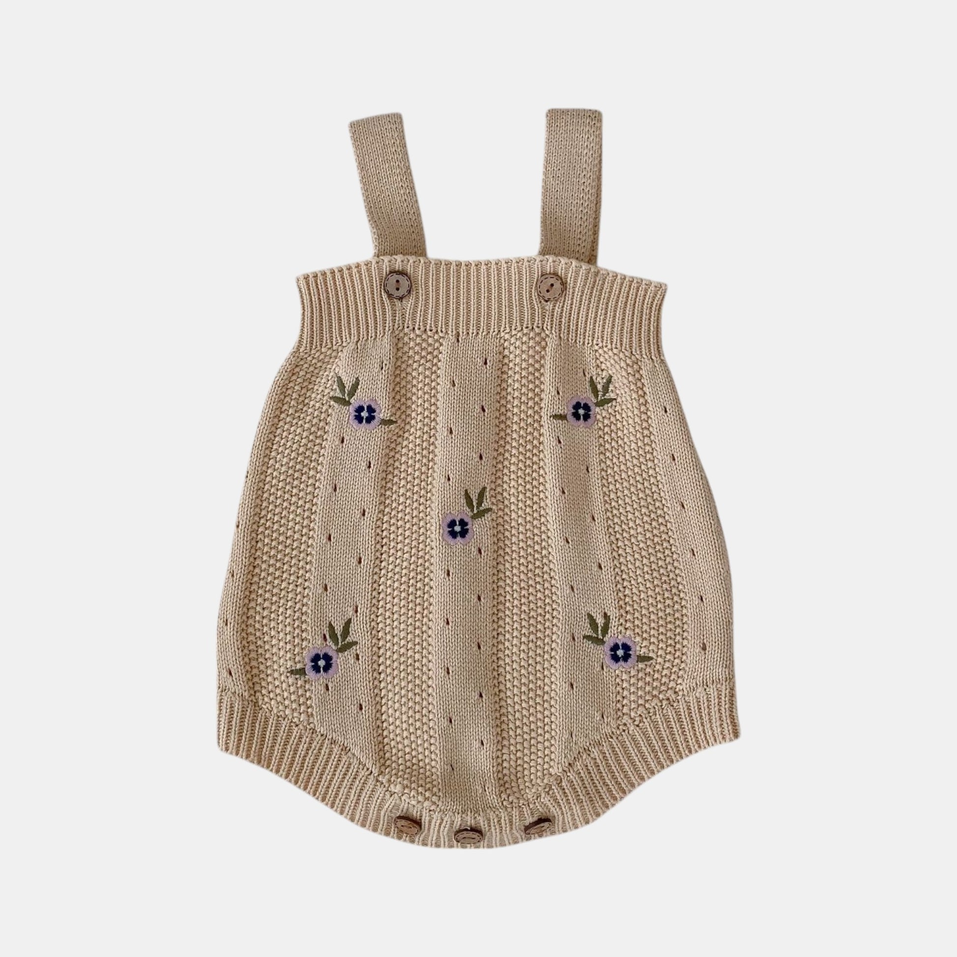 A dreamy khaki romper in buttery-soft cotton, with tiny embroidered violet pansies scattered across the front. The button shoulders and easy leg openings make changing simple, while the lightweight knit keeps little ones comfy. Layer it under the matching cardigan when there's a chill, or let it shine on its own for sunny adventures.