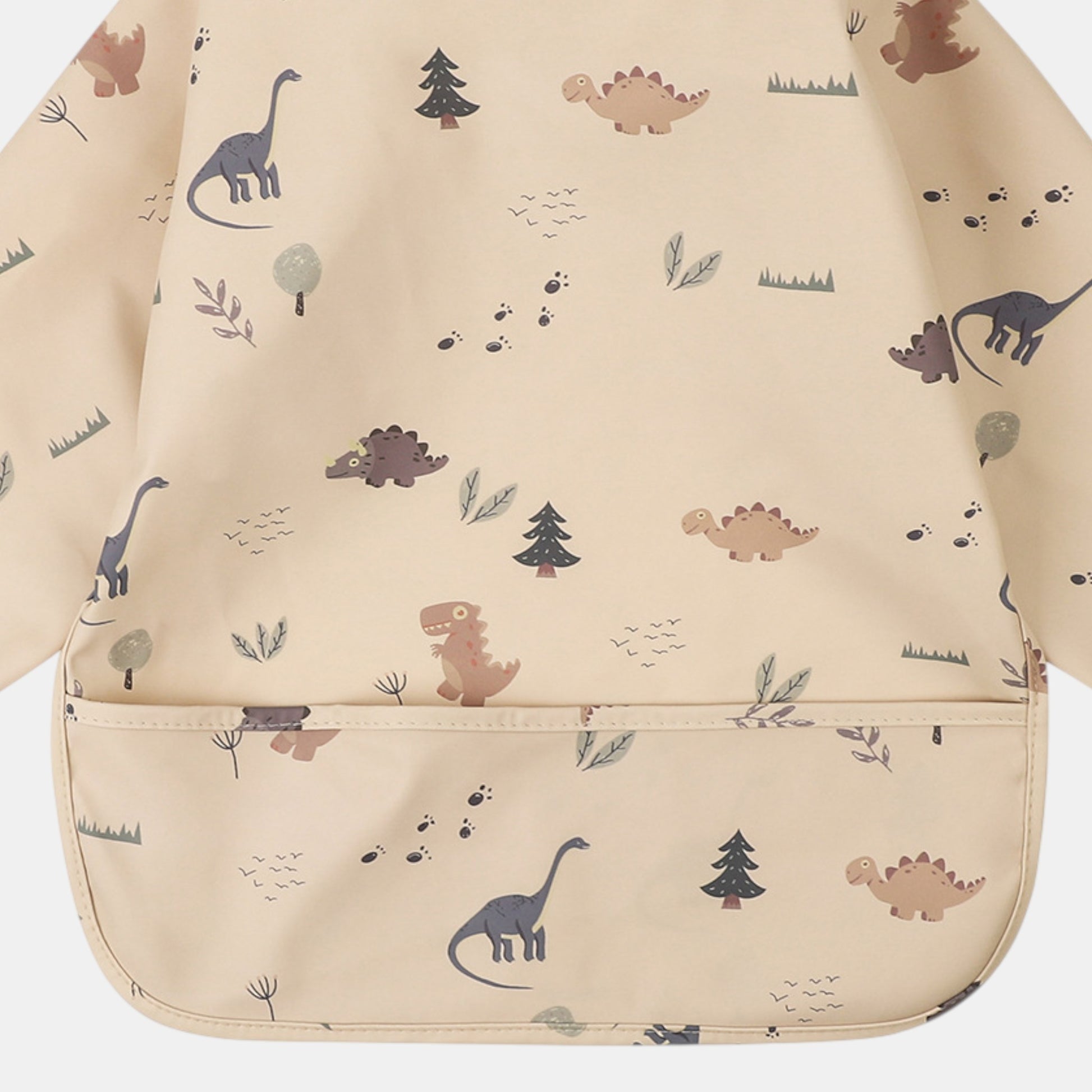 Dinosaurs in gentle, muted tones add a subtle playful touch to this long-sleeve waterproof bib. A large front pocket collects spills, elasticated cuffs keep sleeves tidy, and the snap fastening at the back ensures a secure fit. The breathable half-back and easy-clean material make it practical and comfortable for everyday feeding.