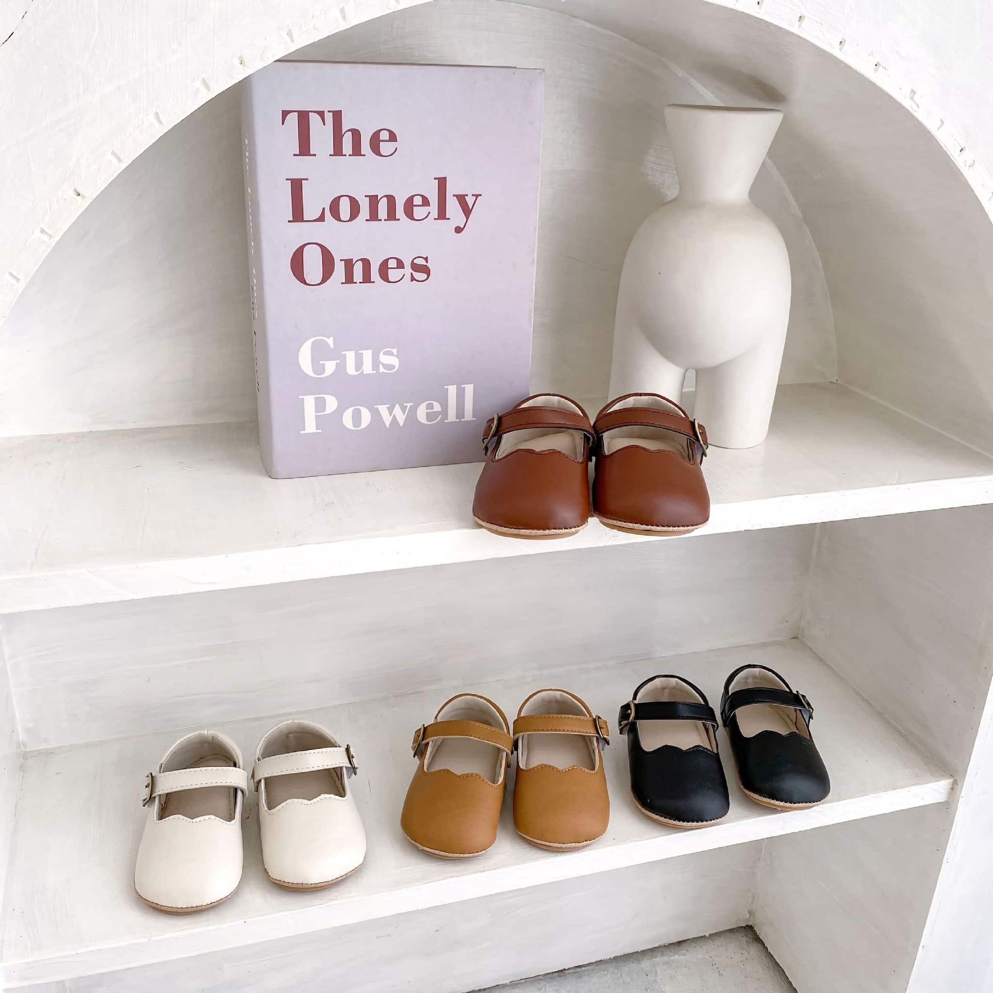 Classic white faux leather shoes with scalloped edges and faux buckle detail. The smooth upper and hidden Velcro make wear effortless, while the textured rubber sole stabilises first steps—perfect for weddings or everyday refinement.